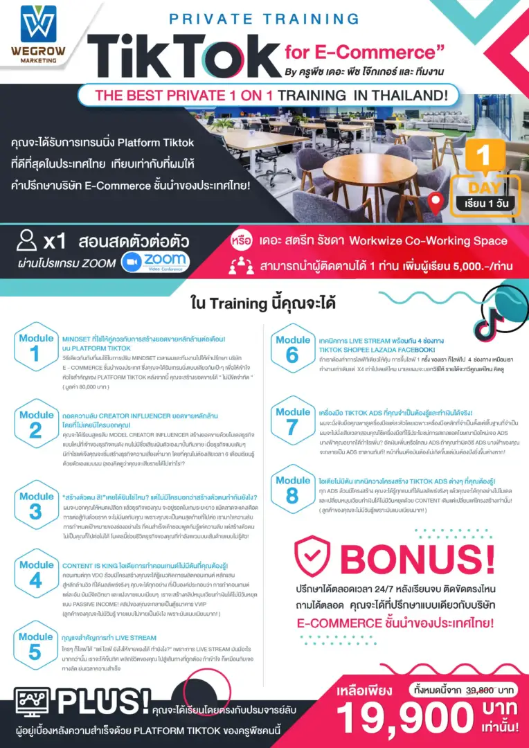 วิธีเดียวกันกับที่ผมใช้ในการปรับ Mindset เวลาผมและทีมงานไปให้คำปรึกษาบริษัท E-Commerce ชั้นนำของประเทศซึ่งคุณจะได้รับเทรนนิ่งแบบเดียวกันเป๊ะๆ เพื่อให้เข้าใจหัวใจสำคัญของ Platform Tiktok หลังจากนี้ คุณจะสร้างยอดขายได้ “ไม่มีขีดจำกัด” ( มูลค่า 80,000 บาท )